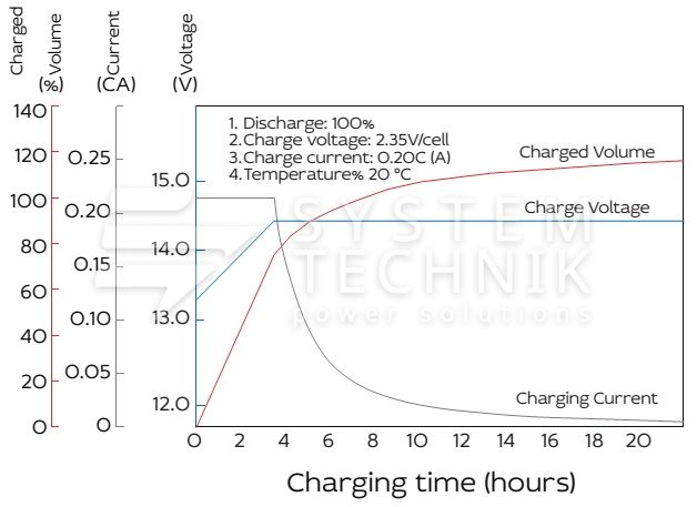 - Рекомендуемое напряжение заряда в циклическом режиме для 12В батареи: 13,5В-14,1В при 25ºС;