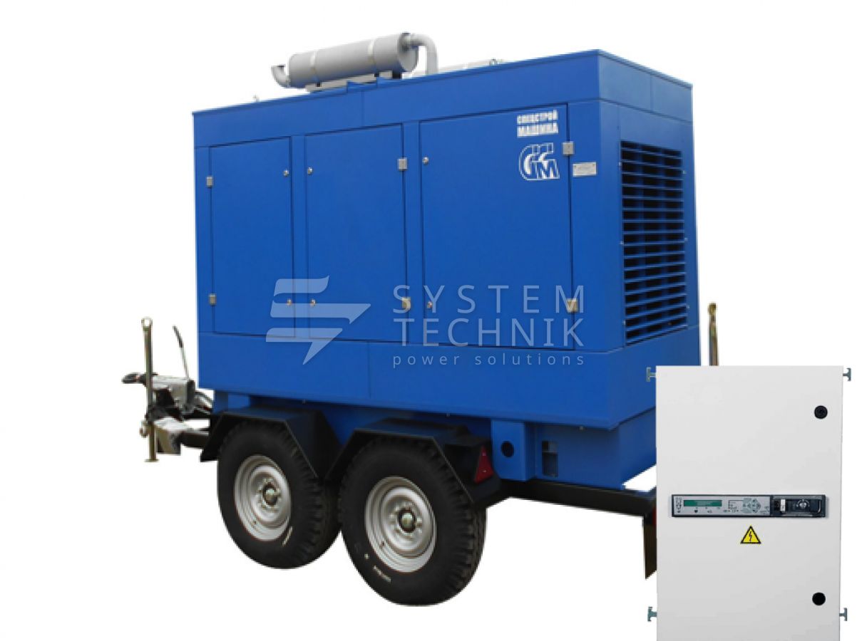 - ССМ ЭД-120-Т400-2РПМ2 (Marelli) в погодозащитном кожухе на шасси с АВР на прицепе